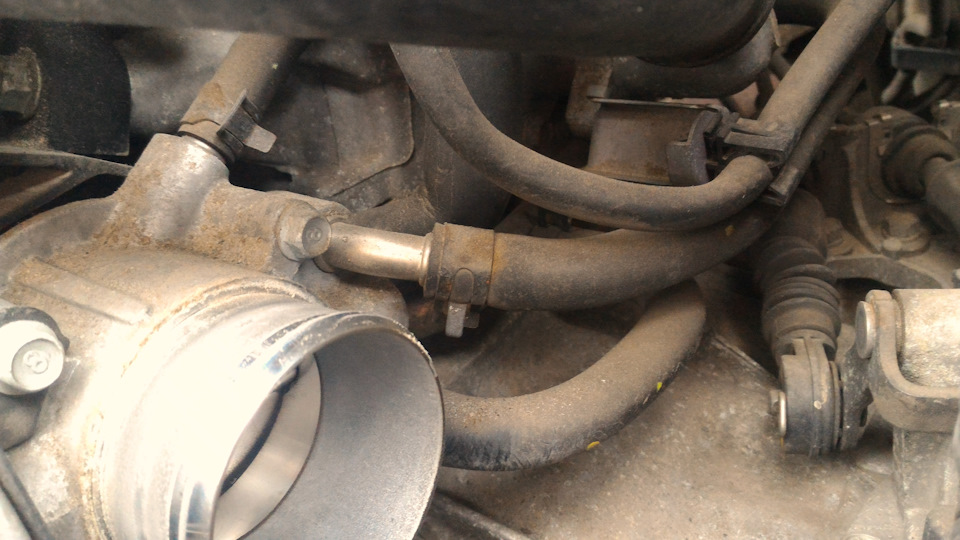 Получаем доступ к патрубку который непосредственно ведет к дросселю. Я не снимал газоотводящий шланг, просто ослабил и снял хомут на дросселе и отвернул всю эту штукенцию.