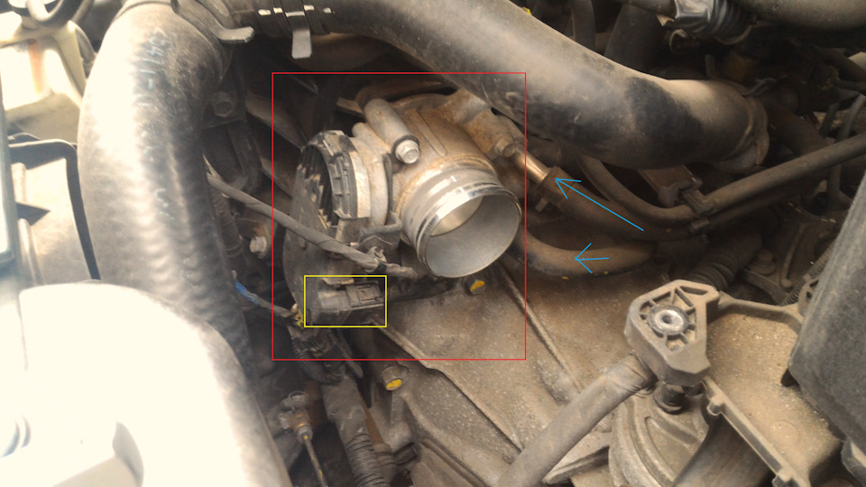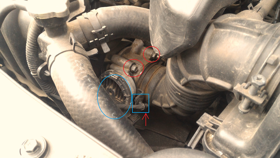 Зеленым показаны патрубки, которые необходимо снять. Надписью ОЖ — отмечены патрубки с антифризом Патрубки закупоренные винтами, в целях сокращения потерь охлаждающей жидкости Теперь, когда нам ничего не мешает отсоединить дроссельную заслонку от корпуса впускного коллектора, приступаем к дроссельная заслонка киа снятию.