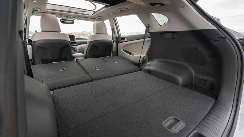 Вполне логично, что при одинаковых размерах кузовов, высоте и колесной базе, внутренние размеры, в там числе, и размеры багажников также будут одинаковыми. Так, у Хендай Туссан 2016 багажник имеет объем 488 л., а при сложенном заднем диване – 1478 л. Багажник Киа Спортейдж 2016, соответственно, 491 л. и 1480 л.