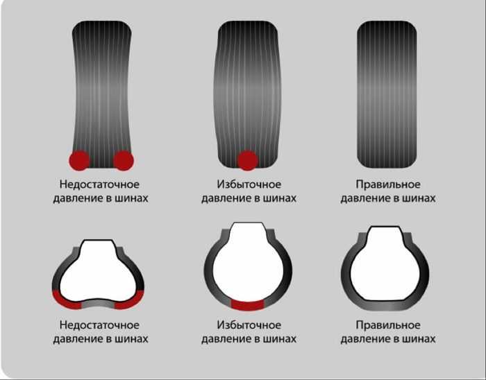 Визуальный осмотр поможет узнать, правильно ли накачаны автошины. На картинке изображены три варианта: первый – низкое давление, второй – высокое, третий – шины накачаны нормально.