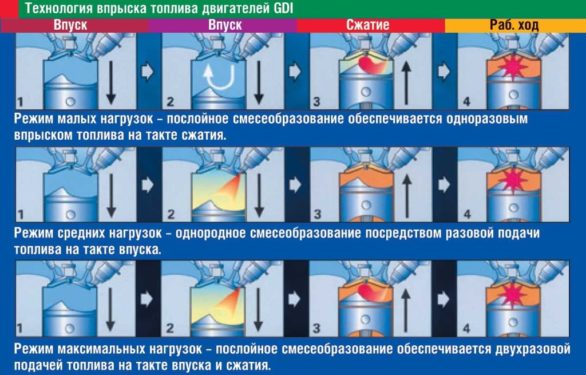 GDI двигатель способен работать в различных режимах (их три), каждый из которых зависит от преодолеваемой нагрузки. Рассмотрим эти режимы:
