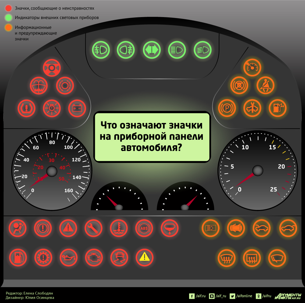 Задача приборной панели показывать состояние систем транспортного средства и оповещать о неисправностях. Рассмотрим, какое значение имеют мгновенно загорающиеся лампочки и индикаторы. Их цвет играет важнейшую роль: