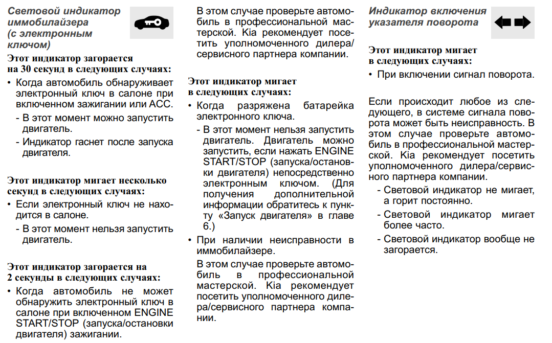 Если сигнальный индикатор иммобилайзера мигает, обратитесь к официальному дилеру Kia для осмотра автомобиля. Сигнальный индикатор иммобилайзера (со смарт-ключом). Иммобилайзер предотвращает угон автомобиля, позволяя только зарегистрированным ключам заводить автомобиль.
