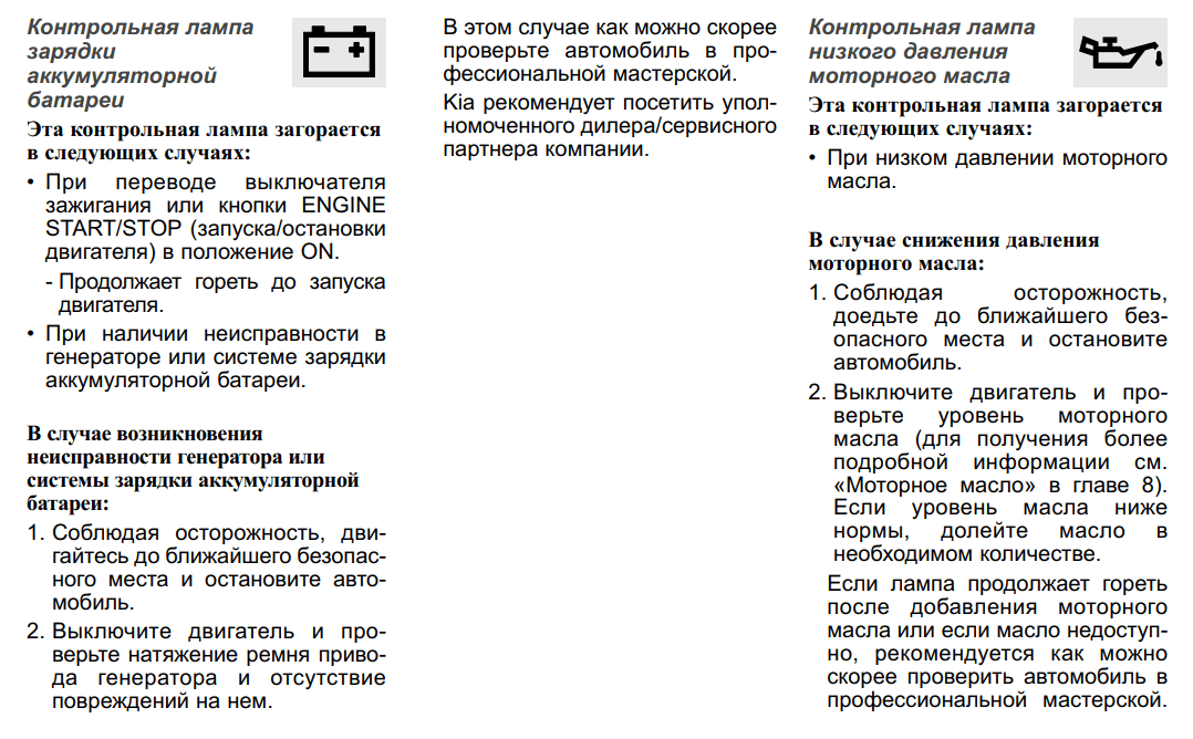 - Низкое давление моторного масла — означает, что давление в системе смазки двигателя снизилось. Когда значок выделен, остановитесь, выключите двигатель и проверьте уровень масла. Если лампа продолжает гореть нормально, обратитесь в сервисный центр.