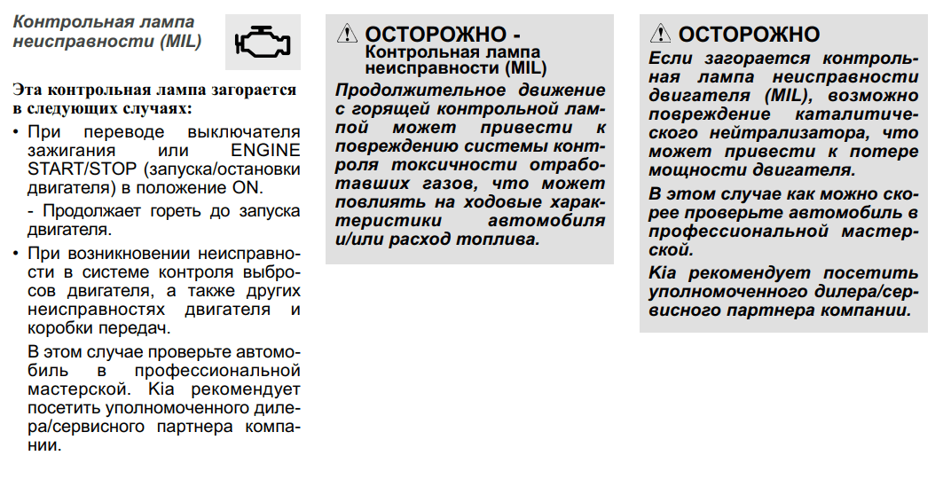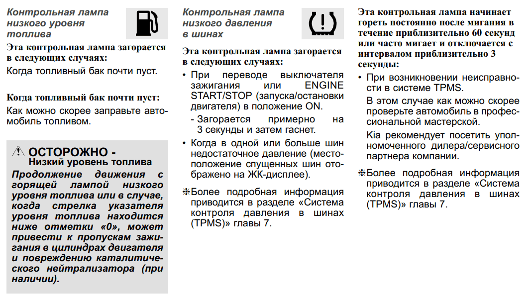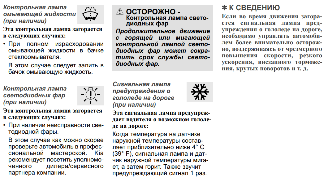 Если смарт-ключа нет в автомобиле или батарея смарт-ключа разряжена при включенном зажигании, сигнальный индикатор иммобилайзера мигает. Нажмите кнопку ПУСК / СТОП двигателя с помощью смарт-ключа. Светодиодный сигнальный индикатор головной фары. Если после запуска двигателя светодиодный сигнальный индикатор головной фары мигает или горит постоянно, обратитесь к официальному дилеру Kia для осмотра автомобиля. Сигнальный индикатор свечей накаливания (в автомобилях с дизельным двигателем). Если сигнальный индикатор накаливания мигает или горит постоянно, обратитесь к официальному дилеру Kia для осмотра автомобиля.