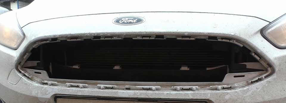 Для этого придется снять решетку радиатора. На РИО она крепится на пластиковых защелках. И проблем с ее демонтажем не возникает.