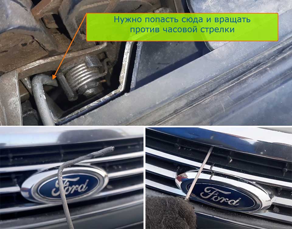 - Для Форд Фокус 3. Снимите защиту радиатора, найдите трос и дерните его в левую сторону от фары или дотяните до рычага и толкните.