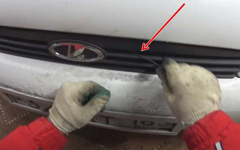 - Просуньте проволоку в верхнюю секцию решетку справа от значка ВАЗ на 15-20 см. Задача в том, чтобы потянуть за пружинку на замке.