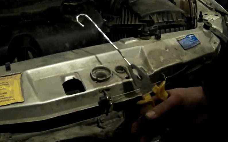 Просуньте его в радиаторную решетку или же воздухосборник. Задача заключается в том, чтобы достать до язычка, закрепить крючок и дернуть за. Другой вариант подразумевает использование защиты картера. Чтобы быстрее справиться, нужен помощник. Необходимо поднять автомобиль на домкрат или же найти смотровую яму.