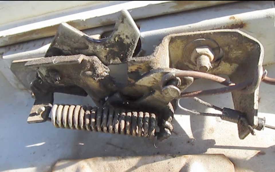 - При повреждении тросика возле замка придется искать выходы к защелке и выгибать ее.