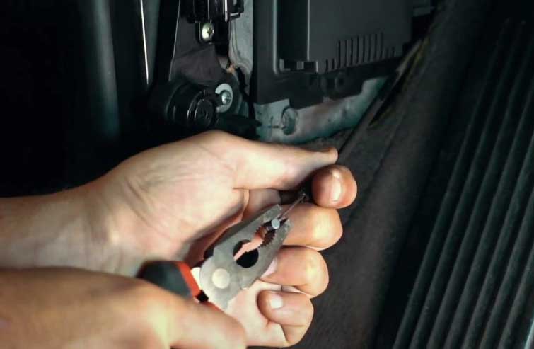 - Возьмите пассатижи и потяните за центральную часть тросика. Зажмите только металлическую сердцевину, видь оплетка может не выдержать нагрузки.