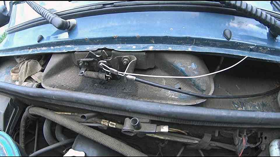 - Найдите участок тросика, который идет к защелке замка капота.