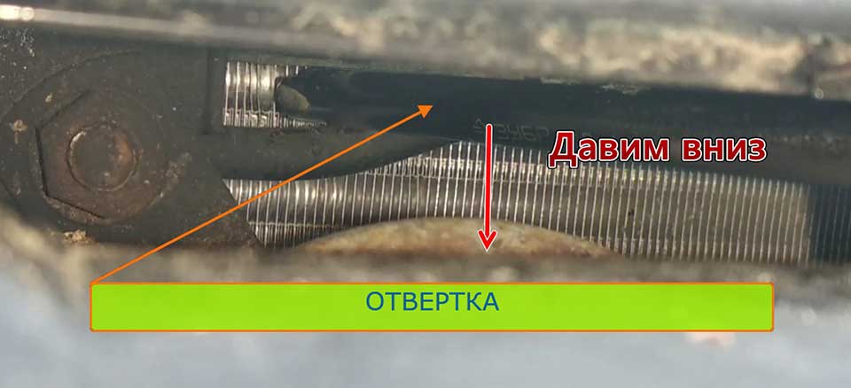 - Возьмите длинную отвертку и просуньте ее под тросик.