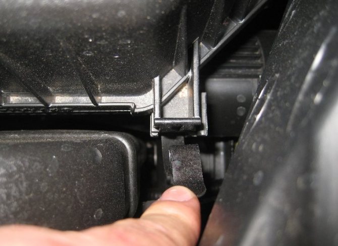 С правой стороны корпуса фильтра, находится две железных защелки, которые необходимо отщелкнуть, просто потянув на себя. Затем поднимите пластиковую крышку корпуса воздушного фильтра вверх и вы увидите старый воздушный фильтр Киа Рио.
