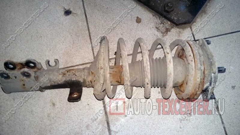 Для окончательного разбора амортизационной системы Киа Спектра потребуется открутить на ней гайку, расположенную в центре. Это позволить демонтировать пылевую защиту, пружину, саму стойку и отбойник – если требуется заменить только пружину. Процедура сбора переднего амортизатора Kia Spectra происходит в обратном порядке.
