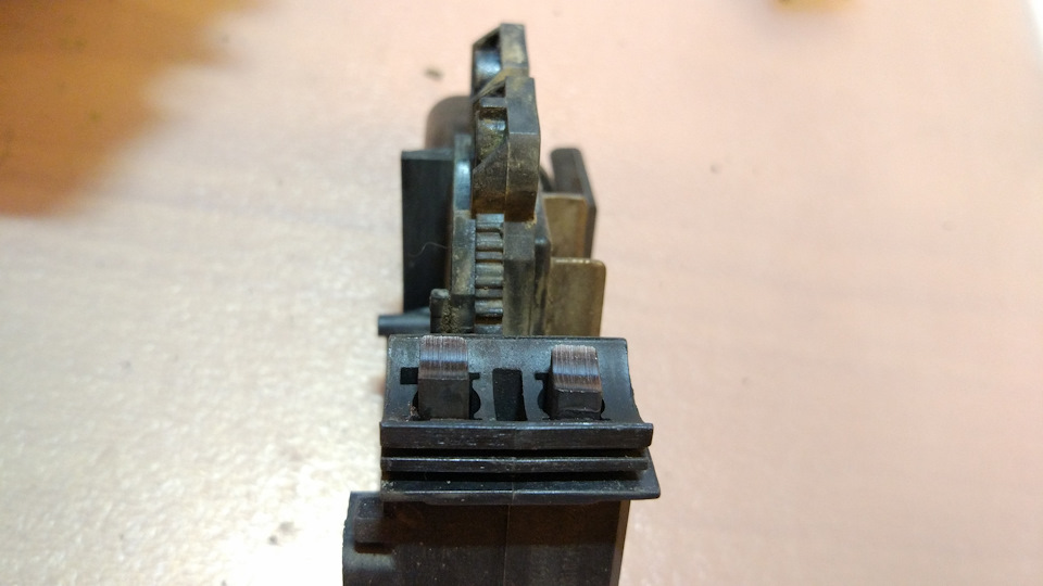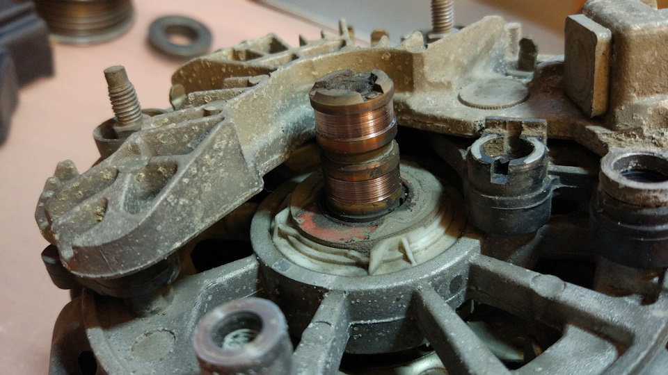 Снимаем щеткодержатель, смотрим состояние контактных колец и щеток. В моем случае износ у щеток и колец неравномерный, верхняя щетка изношена более чем на половину. Можно было бы щетки не трогать и еще год-два ездить, но это не наш метод…