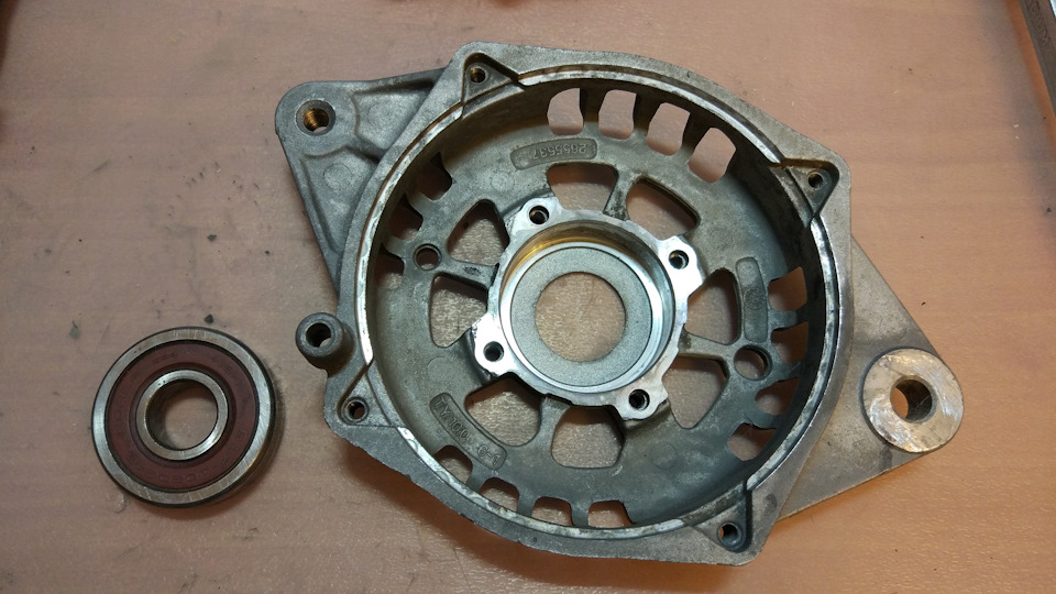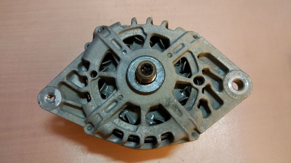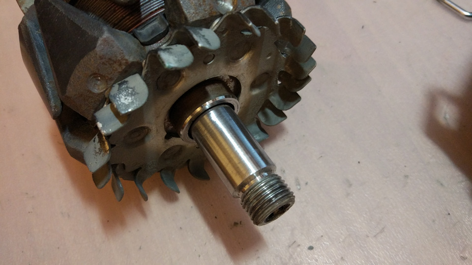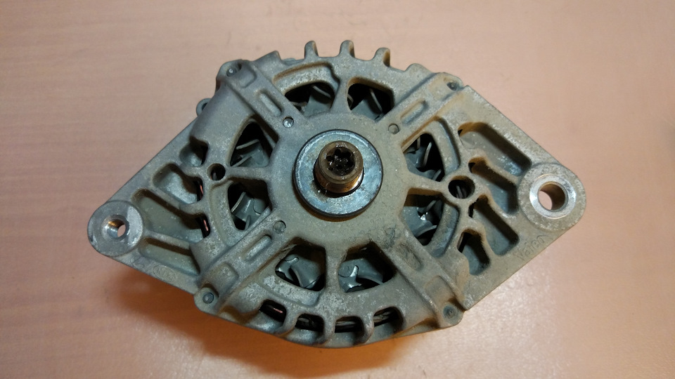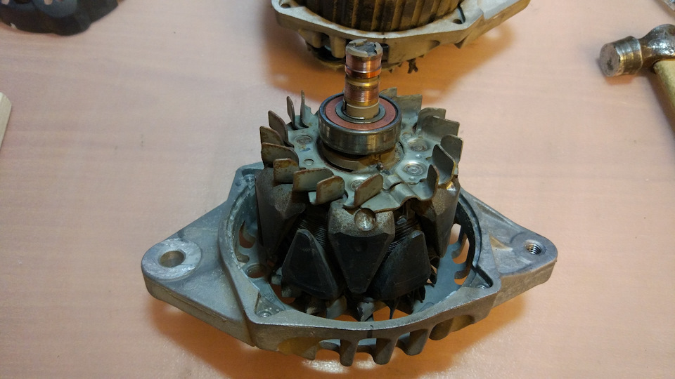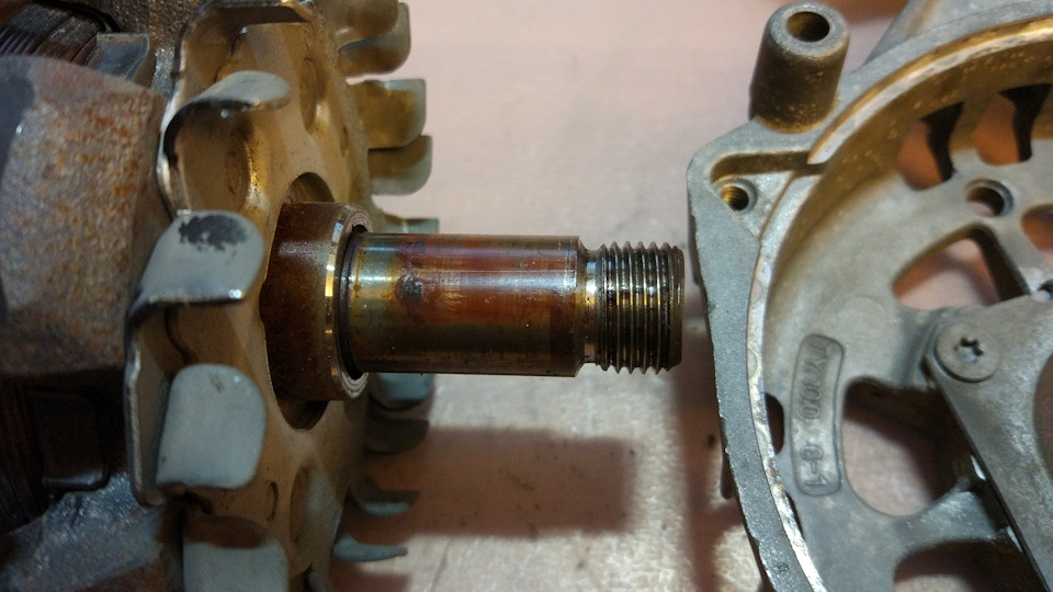 Теперь нужно было выбить ротор из крышки с подшипником. Для этого пришлось опереть крышку на две табуретки и придерживая снизу ротор ударить сверху по валу с накрученной гайкой. Боялся что ребра крышки не выдержат таких нагрузок, поэтому в каталоге местной разборки был примечен б/у генератор за 2к рублей, на случай если сломаю крышку ))) Однако ребра выдержали и ротор вышел. Тут стало ясно почему он никак не поддавался, причиной была коррозия на валу.