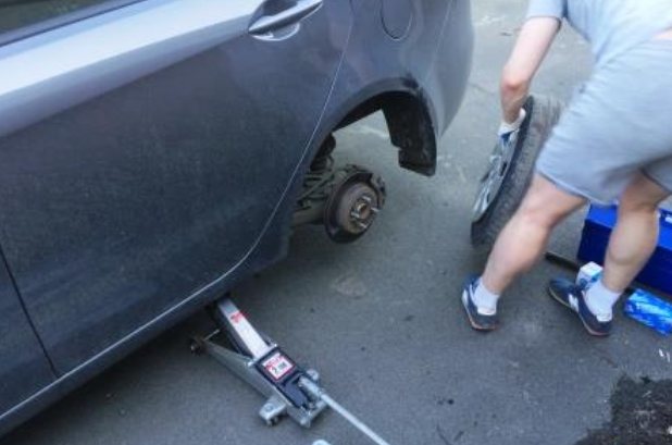 Конечно, все начинается с простого, снятия колеса. При этом, можно мысленно, про себя или если нет никого рядом, укрыть матом шиномонтаж, который затянул болты по самое не могу и конечно не смазав их.