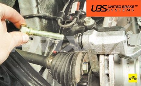 Потяните верхнюю и нижнюю шпильку из их резиновых пыльников и нанесите на них тонкий слой тормозной смазки прежде чем устанавливать их обратно. Направляющая суппорта должна свободно заходить на место, для её установки не применяйте дополнительного инструмента и не забивайте её внутрь.