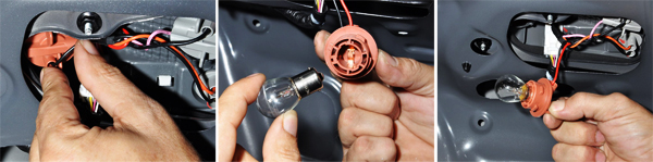 Также поворачиваем против часовой стрелки патрон и вытаскиваем лампочку стоп-сигнала, нажимая на лампочку поворачиваем против часовой стрелки, вынимаем.