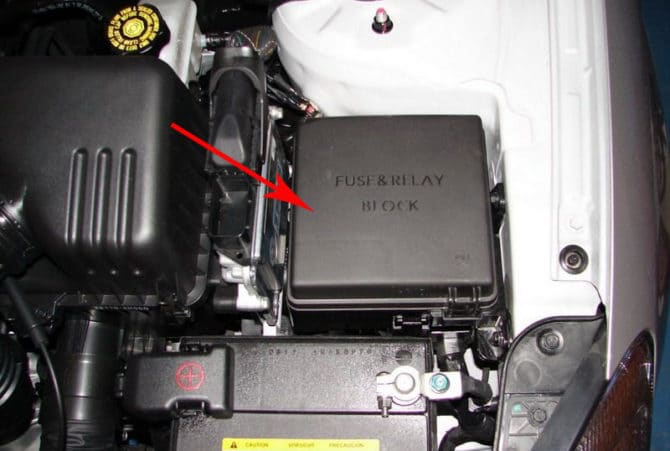 Нередко в момент перегорания галогенной лампочки происходит бросок тока, который выводит из строя предохранитель, отвечающий за ее питание. Если новые приборы установлены, но ближнего света все равно нет, то, скорее всего, это твой случай. Где найти нужный предохранитель? Он расположен в блоке предохранителей. В Киа Сид таких блоков 2. Один находится в моторном отсеке, второй – в салоне, в торце панели приборов слева от водителя. Нас интересует тот, что находится под капотом, я обозначил его стрелкой.