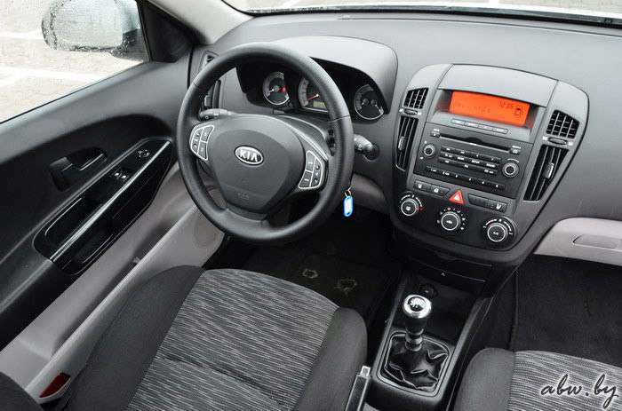 В салоне Kia Ceed универсал 2011 тоже царит добротность и гармония. Торпедо выполнена из мягкого приятного на ощупь пластика. Передние кресла хорошо спрофилированы, регулируются по всем направлениям, здесь с комфортом усядется даже рослый водитель. Обод руля удобно ложится в ладонь, а на его спицах рассыпаны клавиши управления. Эргономика продумана до мелочей и интуитивно понятна, до органов управления не приходится тянуться.
