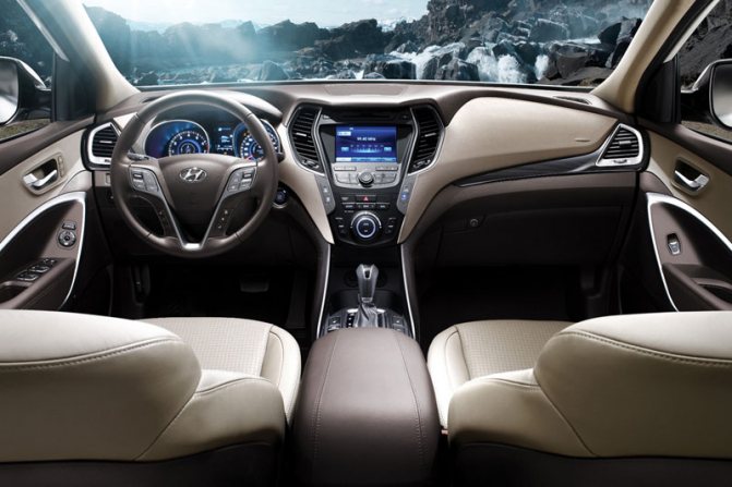 Интерьер Гранд Санта Фе оформлен в популярном нынче стилистическом направлении «hi-tech», согласно которому в салоне основной акцент делается на высокотехнологичность отдельных элементов, и высокий уровень отделки. Отдельно хочется отметить стильную приборную панель, в основе которой лежит большой сенсорный дисплей и два мощных динамика. Что касается руля, то здесь разработчики не стали особо экспериментировать, и использовали «баранку» Санта Фе второго поколения. Под рулевым колесом разместились электронные счётчики тахометра и спидометра, а также компактный дисплей бортового компьютера.