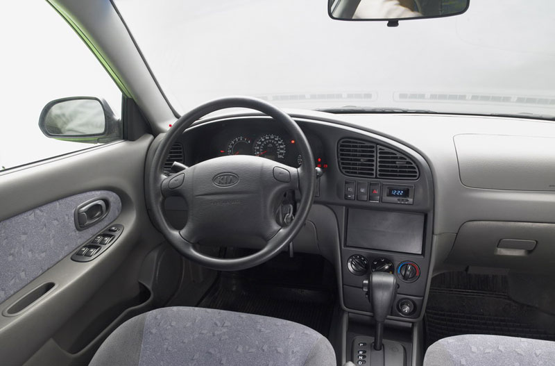 Как и экстерьер, салоны автомобилей напоминают о давно ушедшем прошлом веке. При этом крупная Spectra и вовсе выглядит архаичной, несмотря на более широкий список современного оборудования. Огромные дефлекторы напоминают не то о Москвиче, не то о подержанных «европейцах» 70–80-х годов, которые массово завозились в нашу страну двумя десятилетиями ранее. Панель приборов и вовсе скроена на американский манер — множество мелких шкал в KIA Spectra, а также дополнительная оцифровка спидометра в милях не способствует быстрому восприятию необходимой дорожной информации. На этом фоне крышки отсеков для подушек безопасности, а также CD-магнитола выглядят, как привет из будущего — они несколько разбавляют салон KIA, позволяя ему стать более презентабельным.