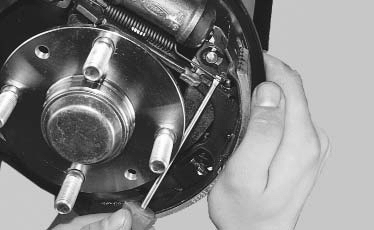 23. Отрегулируйте зазор между тормозными колодками и барабаном, нажав 10–15 раз на педаль тормоза. При каждом нажатии должен быть слышен щелчок регулятора. Как только щелчки прекратятся, зазор установлен.