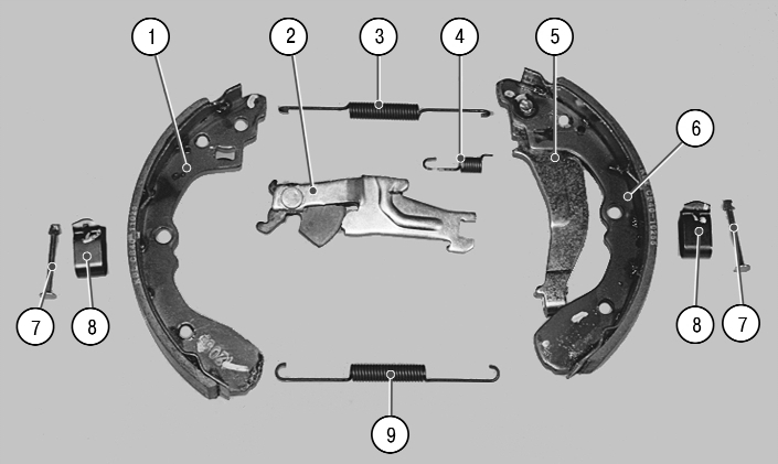 Так выглядят детали тормозного механизма заднего колеса (на фото показаны детали тормозного механизма c левой стороны): 1 – передняя тормозная колодка; 2 – распорная планка; 3 – верхняя стяжная пружина; 4 – пружина разжимной планки; 5 – разжимной рычаг; 6 – задняя тормозная колодка; 7 – опорные стойки колодок; 8 – пружинная пластина; 9 – нижняя стяжная пружина.