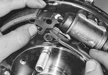 21. Раздвижными пассатижами сожмите поршни тормозного цилиндра и установите тормозные колодки в обратном порядке, устанавливая при этом механизм автоматической регулировки распорной планки в то положение, в котором он находился перед снятием.
