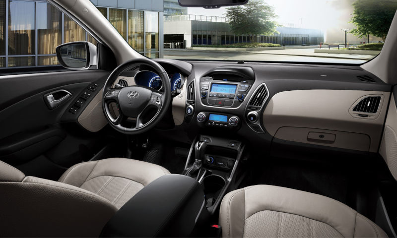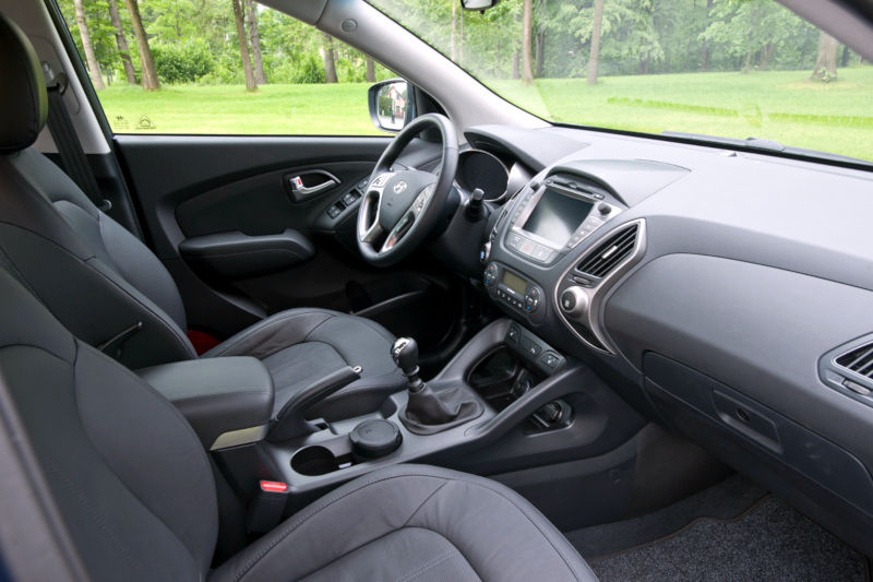 Hyundai ix35 отличается от многих своих аналогов богатейшей комплектацией. Даже в базовом исполнении можно найти целых шесть подушек безопасности, великолепную стереосистему с AUX- и USB-разъемами, принимающую файлы любого типа, функцию автоматического включения фар, семнадцатидюймовые литые диски, подогрев кресел.