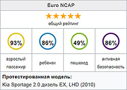 Kia Sportage II 2005, интерьер Sportage заработал высшую оценку 5 из 5 звезд в боковых и фронтальных краш-тестах от Национального управления безопасностью движения на трассах (NHTSA). Однако американский Страховой институт дорожной безопасности (IIHS) дал только 2 из 5 звезд общего рейтинга, подробные оценки смотрите ниже: