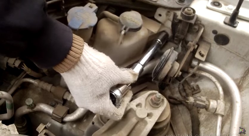 Итак, с пассажирской стороны откручиваем два болта на 10 крепления расширительного бачка и убираем его в сторону.