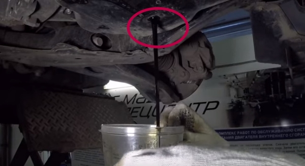 - Поверните ключом размером 24, откройте сливную пробку и удалите старую жидкость. Обычно количество сливаемого масла составляет примерно 5 литров.