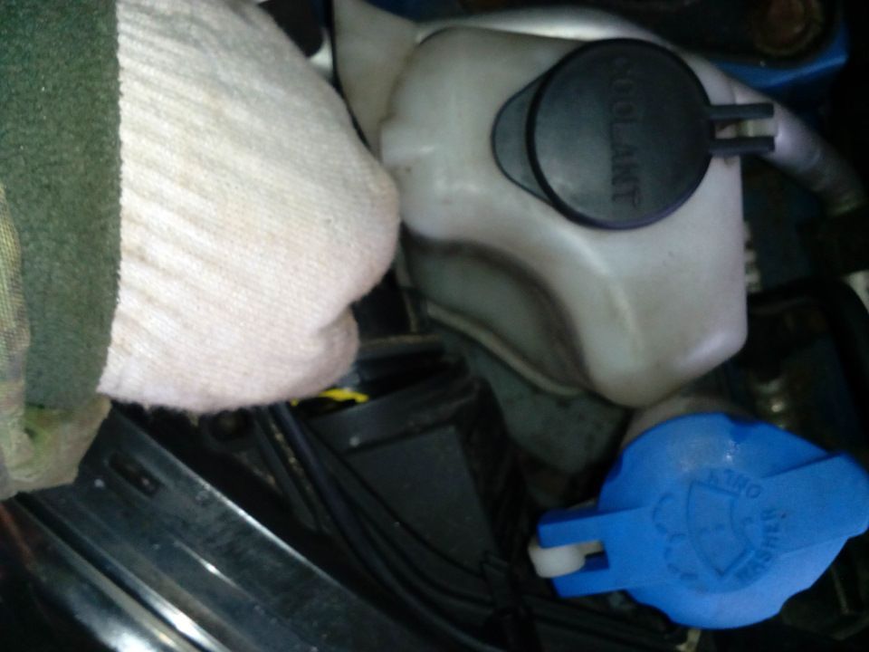 После этого удалось залить в радиатор новый антифриз и тоже дождаться выхода всего воздуха. Заливаем расширительный бачок до планки с буквой F и закручиваем заглушки на радиатор и бачок.