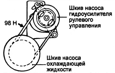 Внимание: проверку прогиба ремня следует производить после проворачивания шкива насоса гидроусилителя рулевого управления на один или несколько оборотов в нормальном направлении вращения.