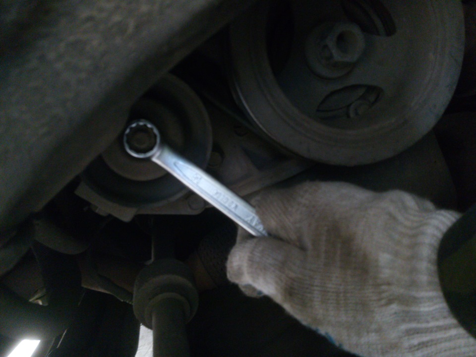 - ослабить и убрать ремень с ролика. Для этого следует отжать кронштейн натяжного ролика;