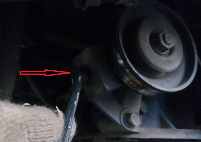 - открутить болт крепления ролика. Чтобы не сорвать резьбу, следует помнить, что резьба именно на этом болте обратная, против часовой стрелки. В работе вместо ключа можно использовать вороток;