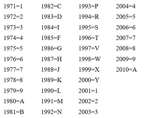 Шестая позиция отражает год выпуска машины. Здесь структура весьма сложная, а сам отсчет берет начало с 1971 года.