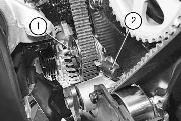 Ослабьте болт 1 крепления оси натяжного ролика и проверните коленчатый вал двигателя на два оборота – под действием пружины 2 ролик займет рабочее положение и ремень натянется.