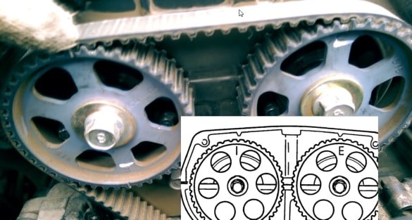 Чтобы выставлять метки было удобно, нужно приподнять правую часть автомобиля при помощи домкрата. Метки, нанесенные на шкив, должны совместиться с метками на корпусе механизма. Снимаем старый ремень. Посмотрите на фотографию ниже.