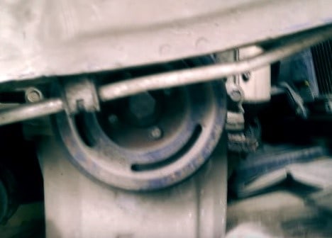 Ослабляем помпу и снимаем ремень дополнительных агрегатов. Снимаем картерную защиту и правое колесо спереди. Теперь ослабляем крепление подушки силового агрегата и откручиваем подушку. Нам будет мешать щуп, которым производятся замеры уровня масла.