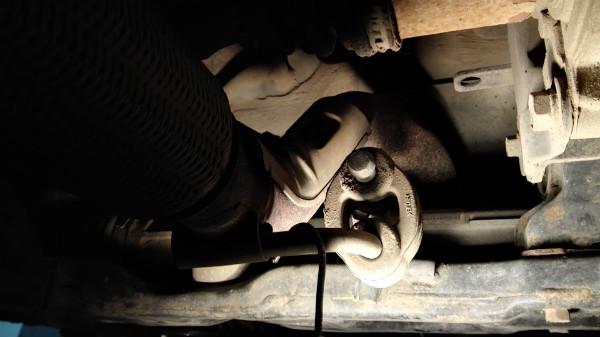 7) Проведите демонтаж резинового демпфера системы выпуска отработанных газов. Он установлен на металлическом штыре. Если не снять, он будет мешать опустить подрамник.