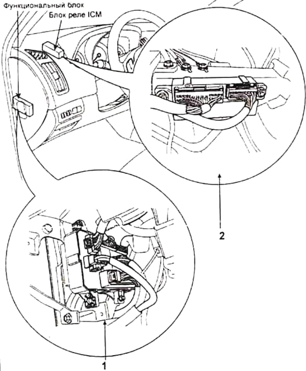 - реле центральной блокировки замков, реле обогрева ветрового стекла, реле задних противотуманных фонарей, реле звукового сигнала предупредительной противоугонной сигнализации, реле датчика дождя, блок реле Built-in-ICM