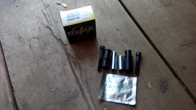 При износе направляющих и втулок стук появляется при торможении, а также на неровностях дорожного покрытия. В наиболее запущенных случаях колодки брякают на протяжении всего времени движения. Для решения проблемы требуется приобрести специальный ремкомплект. В него входят 2 пыльника, 2 направляющие, 2 втулки и специальная смазка.
