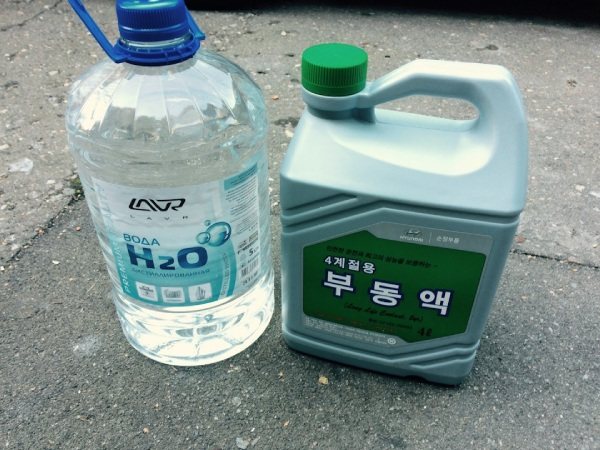 - Вода – доливают дистиллированную, чтобы не было налета на стенках патрубков. Пропорция 1:1 повышает точку замерзания ОЖ до -40 °С и понижает температуру закипания до 150 °С. Большее содержание воды приводит к образованию пены – происходит «завоздушивание» трубок системы и перегрев двигателя.