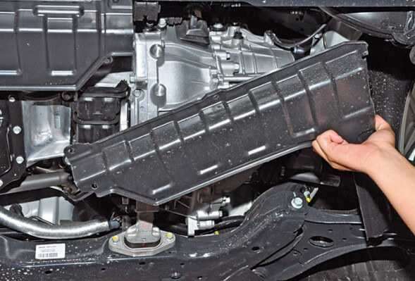 - Подлезают под автомобиль, демонтируют защиту двигателя. Грязезащитный щит расположен с левой стороны мотора.