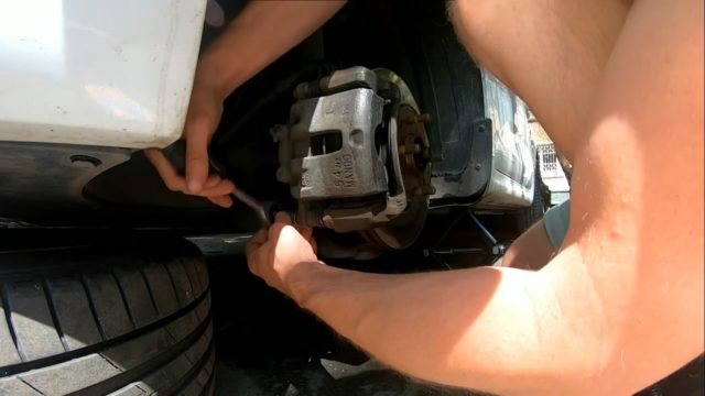 - Плоской отверткой разжимаются колодки для удобного демонтажа суппорта. Откручивается он ключами на 14 и 17.